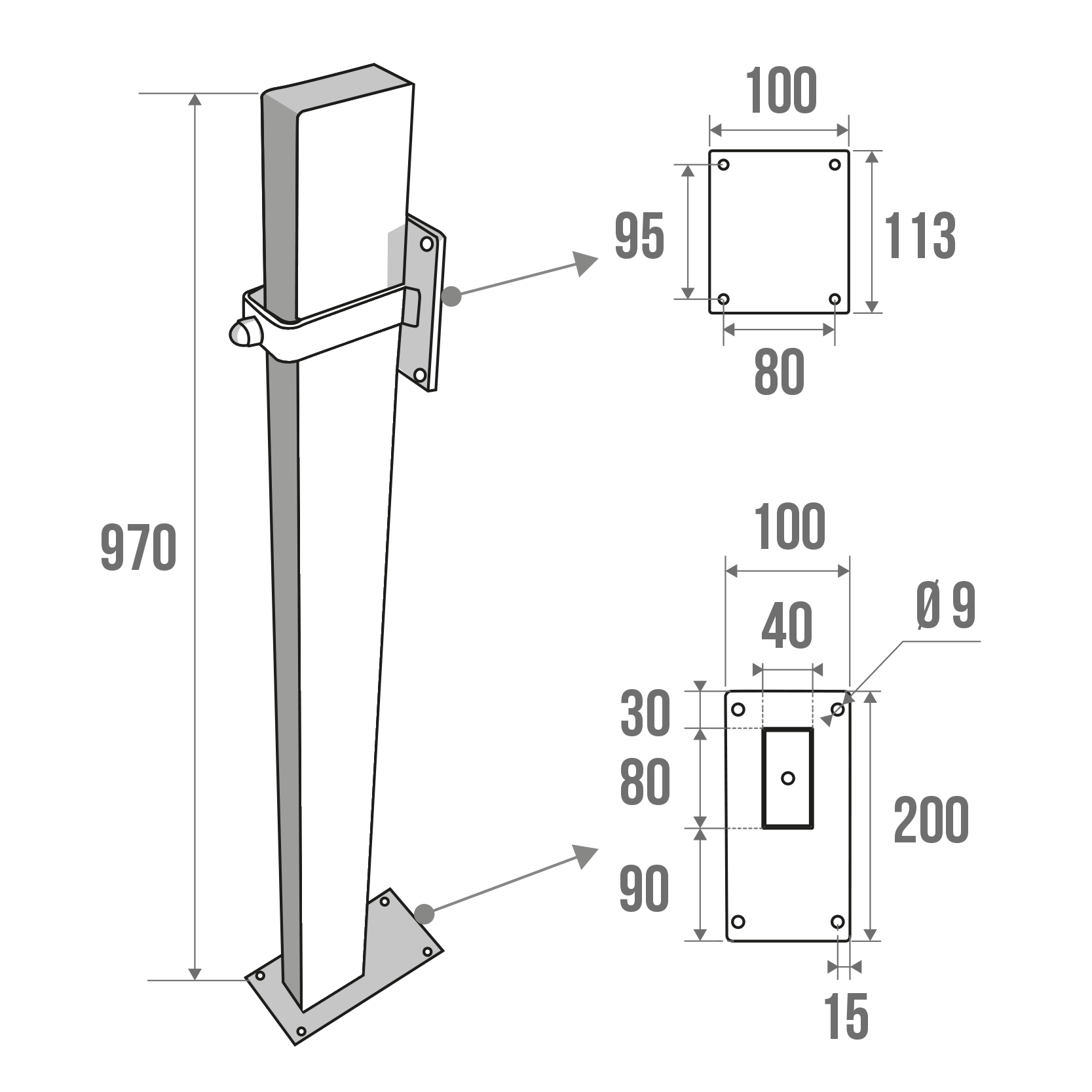Le poteau de fixation en acier avec étrier de fixation permet d'installer une barre relevable lorsque celle-ci ne peut être posée directement sur le mur.