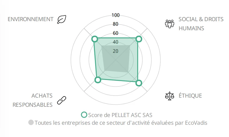 La médaille d’argent nous a été décernée par ECOVADIS, plateforme d’évaluation RSE qui a pour objectif de noter la qualité du système de management de la RSE d’une entreprise à travers ses politiques, les actions mises en place et les résultats. Le score global de PELLET ASC a augmenté grâce à la mise en place de politiques supplémentaires. En 2023, notre entreprise a obtenu un score global de 69/100. Ce résultat nous place parmi les 25% meilleures entreprises évaluées par ECOVADIS.