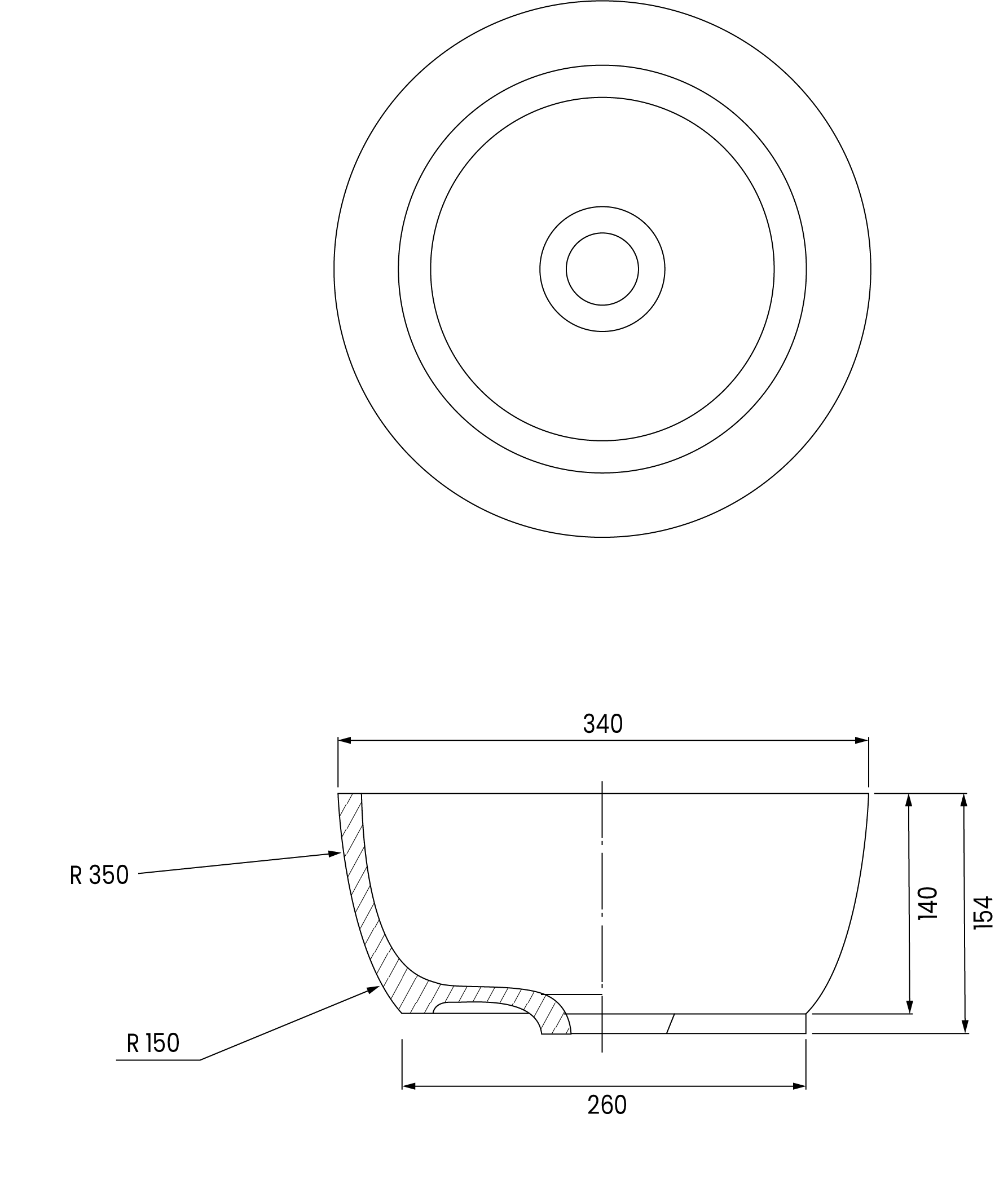 Cette vasque, d'un diamètre de 340 mm, est conçue sans trop-plein.