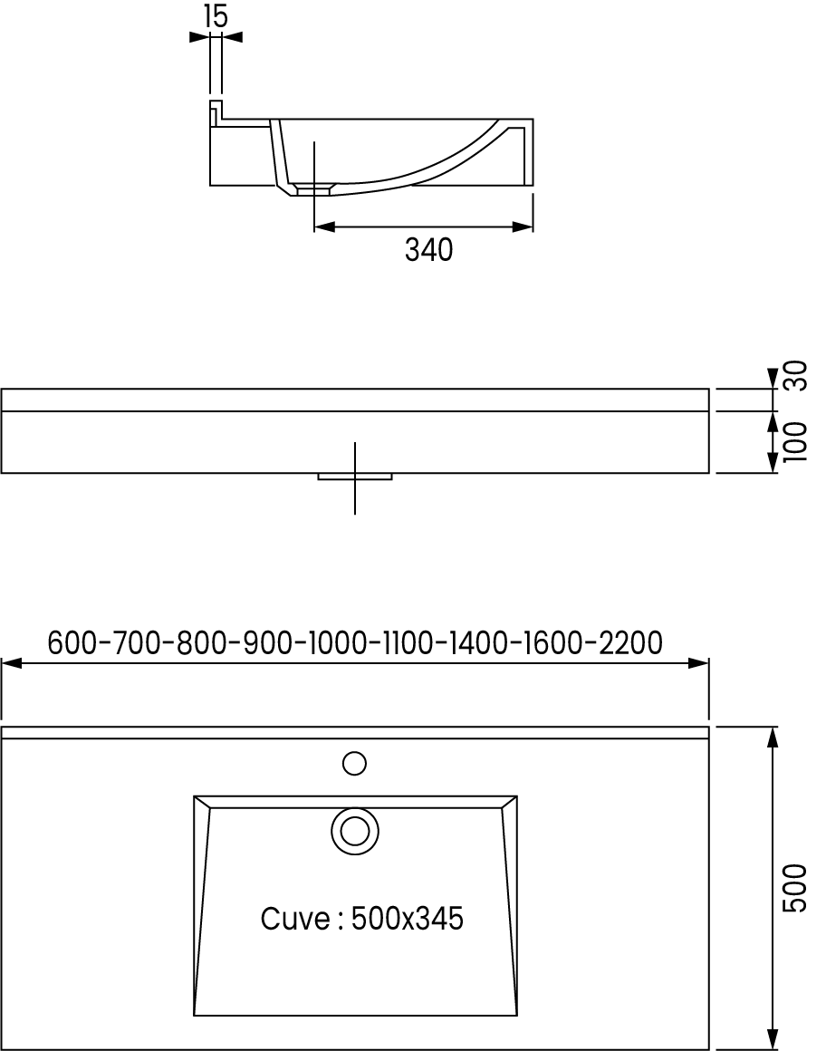 Ce plan vasque est disponible en plusieurs dimensions allant de 600 mm à 2400 mm et peut accueillir jusqu'à trois vasques.