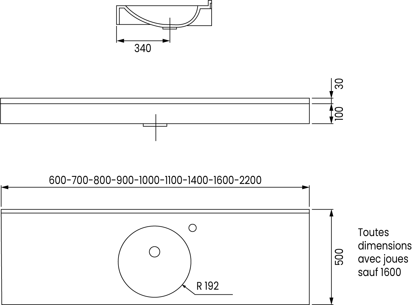 Ce plan vasque est proposé en différentes dimensions allant de 600 mm à 2400 mm et peut accueillir jusqu'à trois vasques de 380 mm de diamètre.