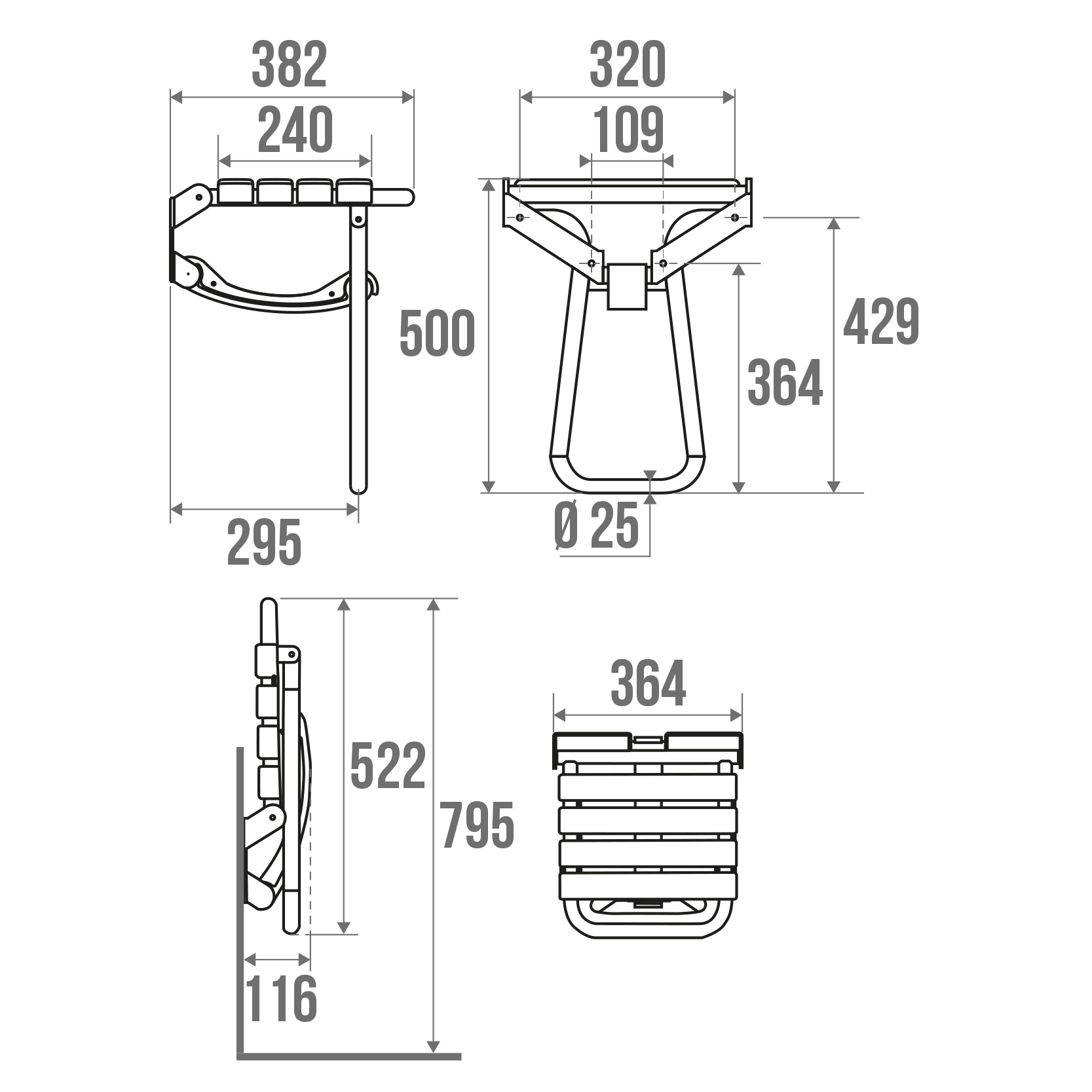 Escamotable avec béquille automatique. Déclipsable et interchangeable avec la tablette de douche.