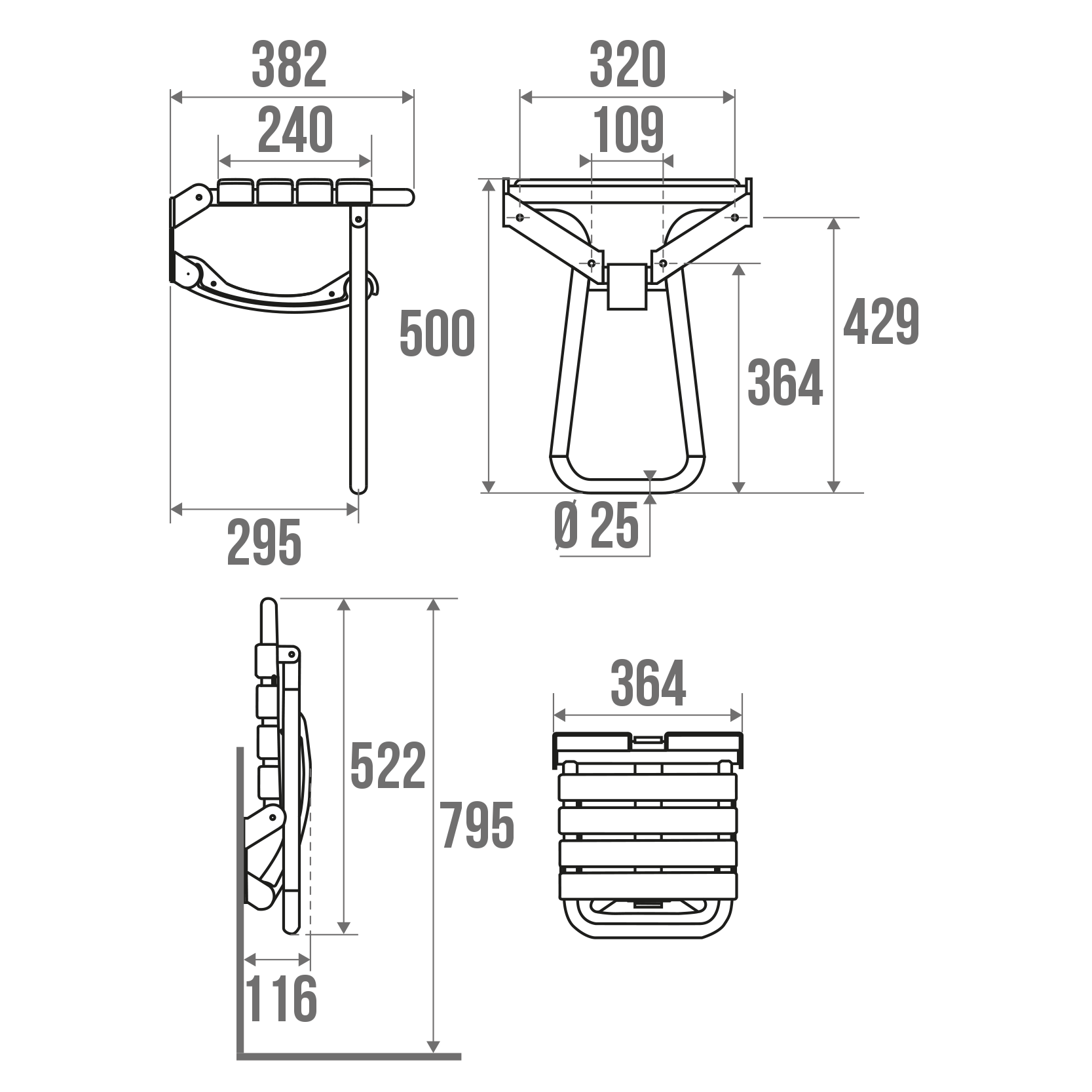 Assise à lattes. Escamotable avec béquille automatique.