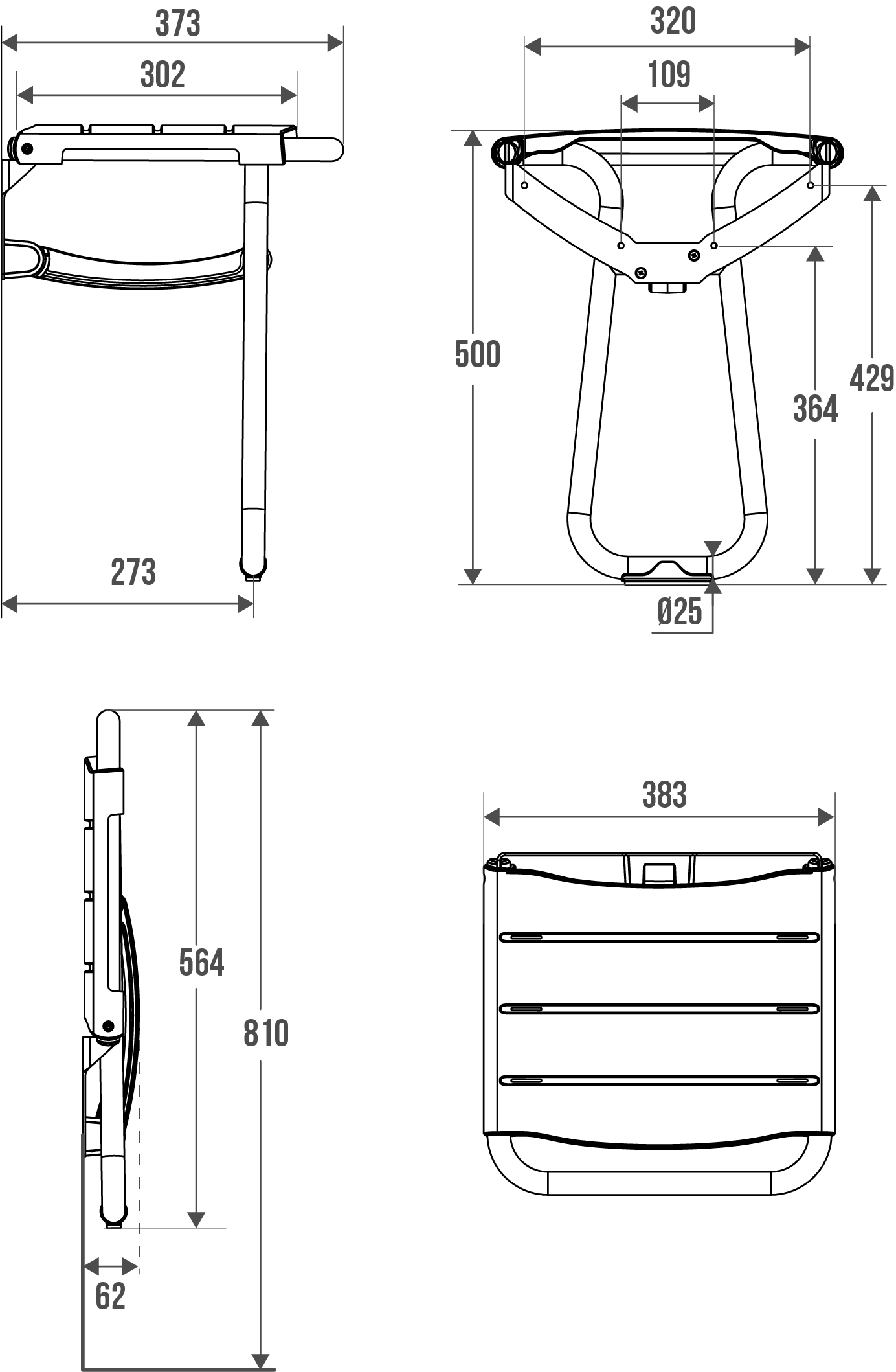 Assise monobloc. Encombrement de 62 mm une fois replié. Escamotable avec béquille automatique.